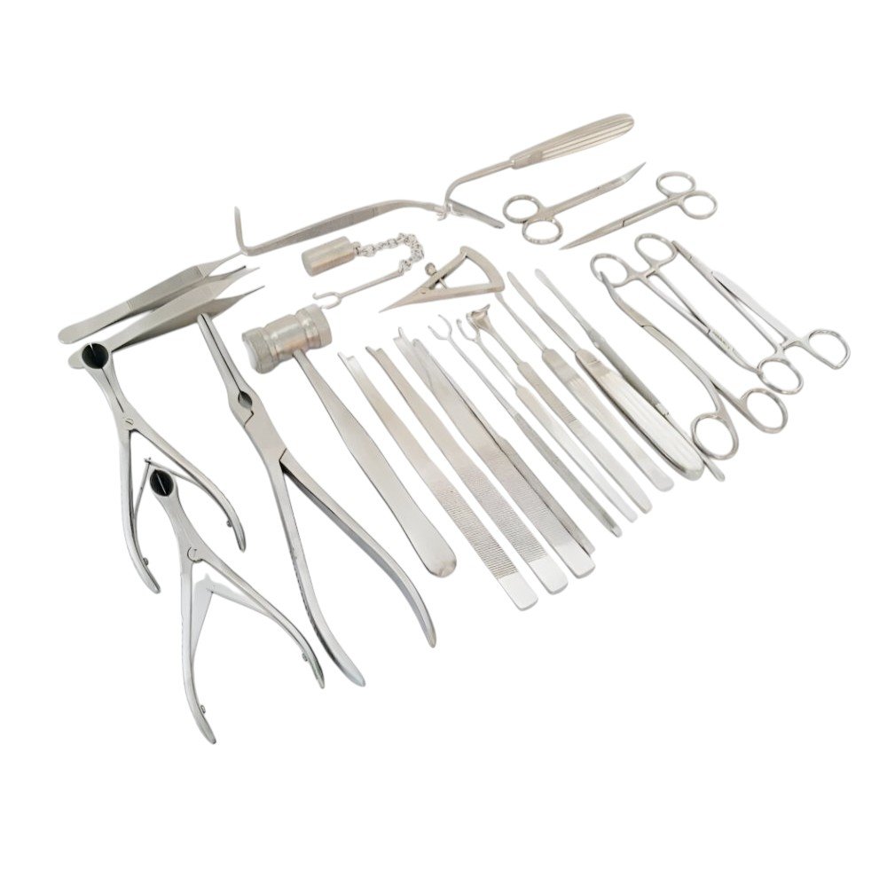 The Rhinoplasty Nose Surgery Surgical Orthopedic Instruments – 25 PCs Set is a 25-piece professional-grade surgical instrument collection designed specifically for nasal reconstruction and cosmetic rhinoplasty. This complete set includes precision instruments such as elevators, chisels, rasps, retractors, and forceps — each crafted for fine manipulation and tissue handling during delicate nasal surgery. Manufactured from high-quality surgical stainless steel, these instruments ensure accuracy, balance, and smooth operation for both reconstructive and cosmetic nasal procedures. Designed to meet the exacting standards of ENT and plastic surgeons, this set delivers the performance and reliability needed for consistent, aesthetic surgical outcomes.