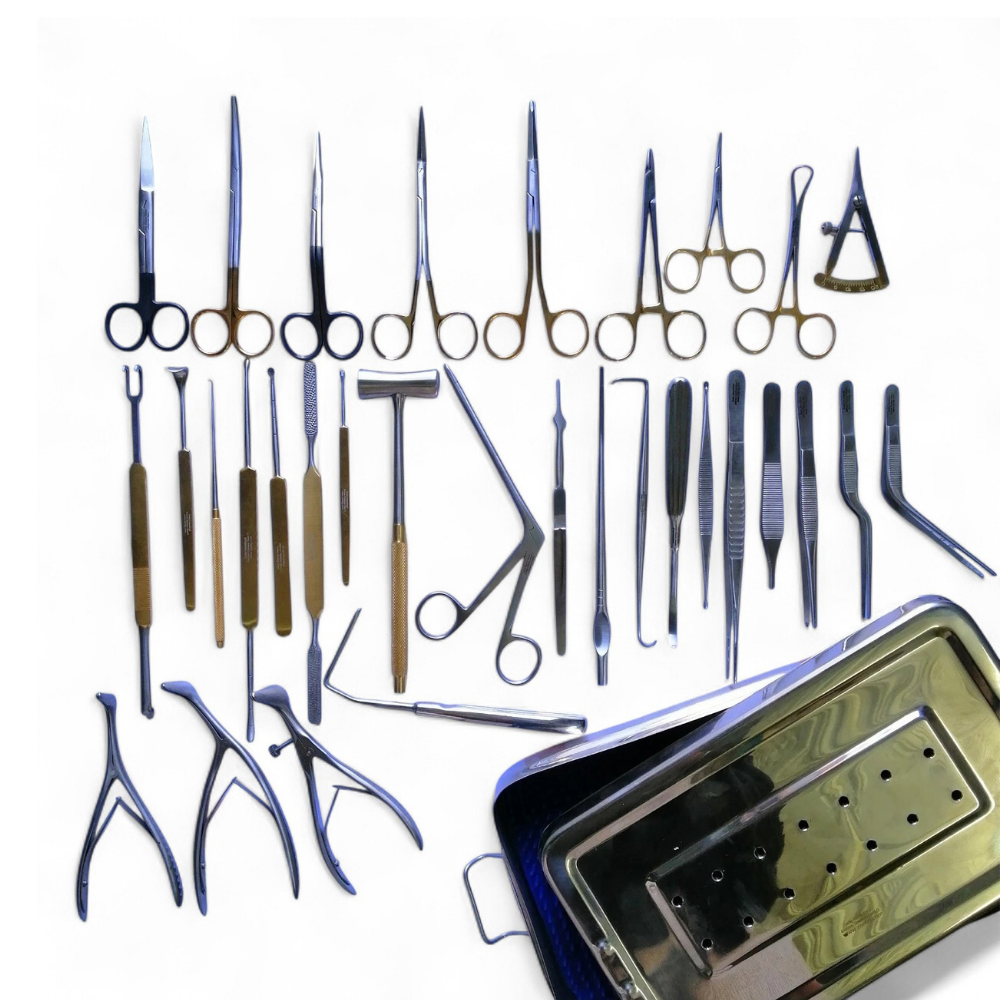 This Rhinoplasty Set – 32 pcs Packed in Sterilizing Box (Plastic Surgery) is designed for precise nasal reshaping, septoplasty, and reconstructive plastic surgery. Manufactured from high-quality surgical stainless steel, the instruments deliver excellent durability, corrosion resistance, and smooth surgical performance. The set includes elevators, rasps, scissors, forceps, chisels, and retractors packed in a stainless steel sterilization box for safe storage and efficient sterilization.