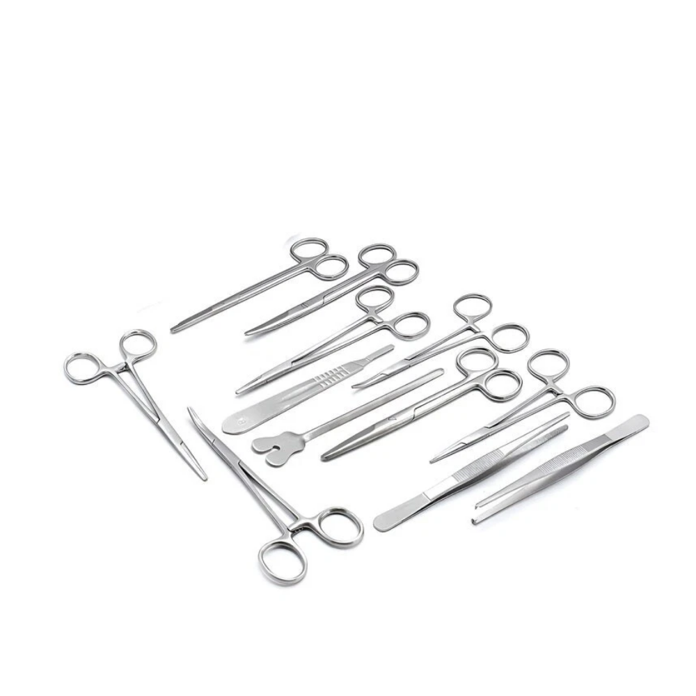• Includes essential tools for incision, dissection, grasping, and suturing