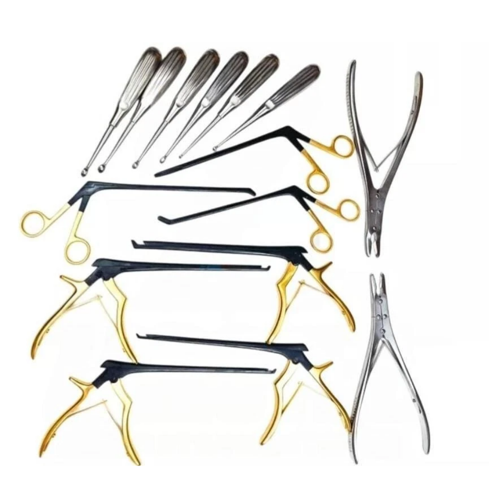 The Spinal Surgery Basic Set – Curettes, Kerrisons & Rongeurs Complete Premium Quality System includes a complete selection of essential instruments such as curettes, Kerrison rongeurs, pituitaries, and bone-removal tools designed for foundational spinal procedures including decompressions, discectomies, and bone remodeling. This set is precision-crafted to ensure sharp, smooth cutting performance and ergonomic handling, allowing surgeons to remove lamina, ligamentum flavum, disc fragments, and bony debris with accuracy and minimal trauma. Made from medical-grade stainless steel, the instruments provide long-lasting sharpness, reliable mechanical strength, and excellent surgical efficiency. This all-in-one kit is ideal for spine surgeons, neurosurgeons, and orthopedic specialists who require consistent instrumentation for everyday spinal operations.