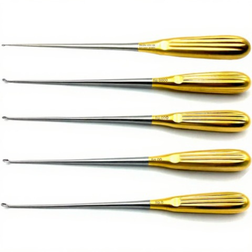 The curved design allows surgeons to reach deep and confined anatomical areas with greater ease, making them ideal for procedures involving the removal of diseased or necrotic bone tissue, curettage of bone cavities, and delicate shaping of bony surfaces. Their sharp, scoop-shaped tips provide excellent control for accurate scraping while minimizing tissue trauma.