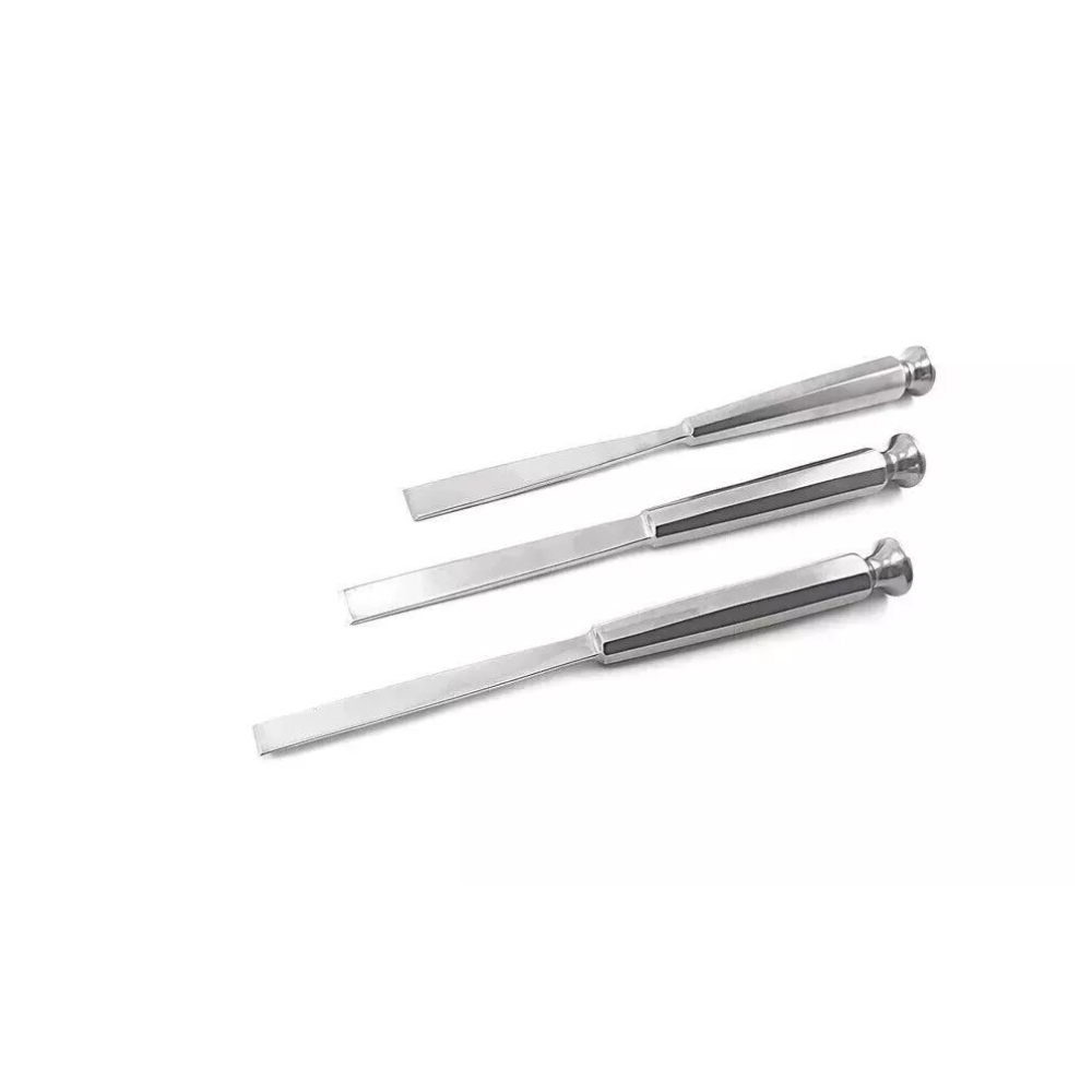 The Stainless Steel Osteotome Set – Pack of 3, Orthopedic Surgical Instruments is a precision orthopedic instrument kit designed for cutting, shaping, and preparing bone during fracture repair, reconstructive surgery, or arthroplasty procedures. Each osteotome is crafted from premium surgical-grade stainless steel for maximum durability, corrosion resistance, and repeated sterilization. The set includes a variety of blade widths and tip shapes to accommodate different surgical needs, from fine bone work to major osteotomies. Ergonomic handles provide comfort and control, allowing surgeons to perform bone cutting with precision and minimal effort.