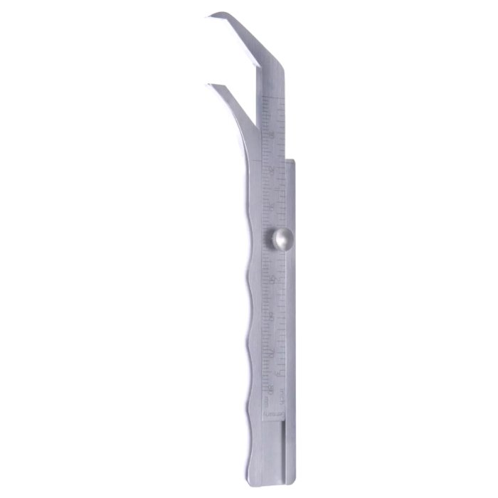 The Thorpe Caliper with angled 3mm tips is a specialized measuring instrument designed for surgical precision in small and intricate anatomical areas. Its angled design provides improved visibility and access to hard-to-reach locations, while the 3mm fine tips ensure delicate tissue handling without trauma. Constructed from surgical-grade stainless steel, it combines durability with a lightweight structure, enabling superior tactile feedback during microsurgical and ophthalmic operations.