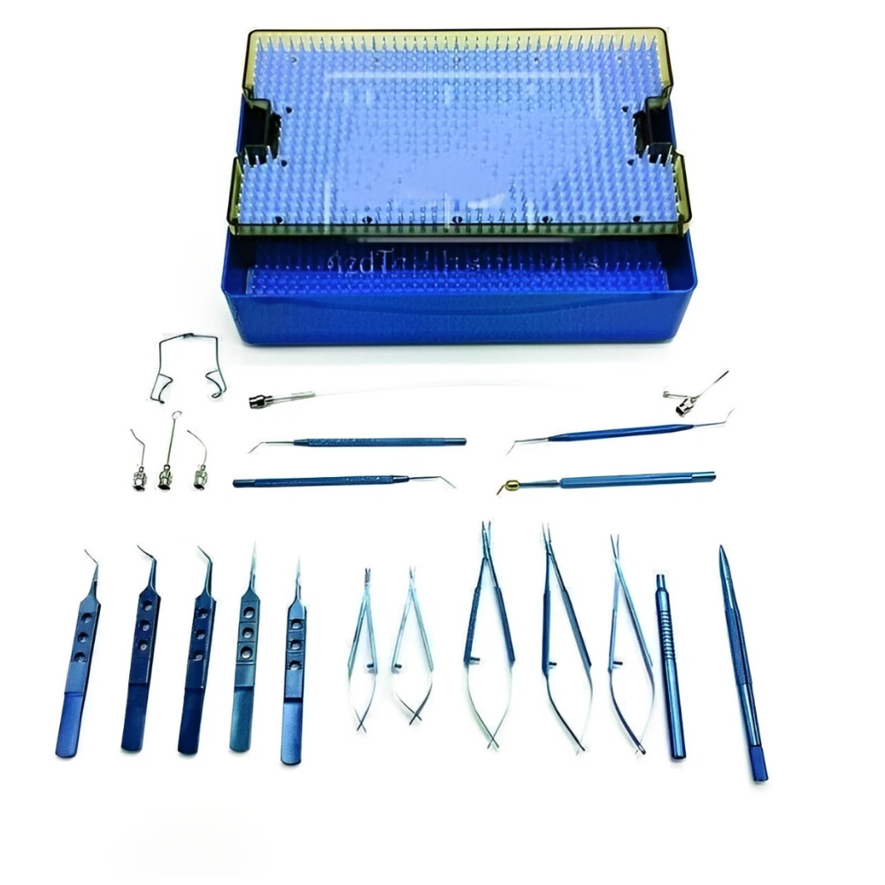 The Titanium-Coated Cataract Set – Ophthalmic Surgical Tools (21 PCS) with Sterilization Tray is a comprehensive ophthalmic instrument kit designed for cataract surgery, including phacoemulsification, IOL implantation, and delicate anterior segment procedures. Each instrument is titanium-coated to provide superior hardness, reduced friction, and long-lasting durability. The set includes forceps, scissors, cannulas, hooks, and other specialty tools essential for modern ophthalmic surgery. A custom sterilization tray ensures organized storage, safe handling, and efficient autoclaving between procedures.
