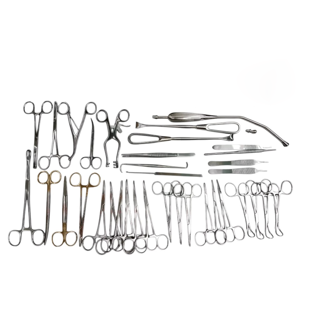 Complete set of 34 instruments required for safe tracheostomy procedures