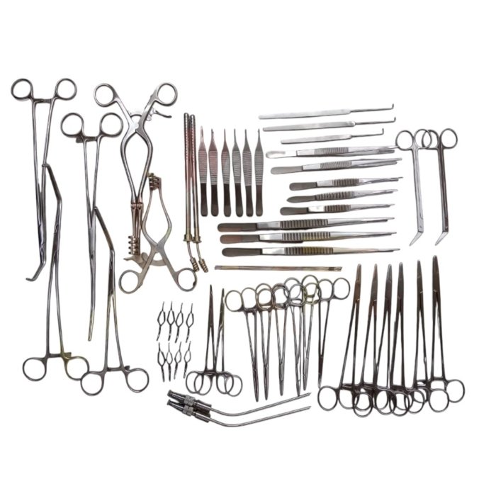 Includes clamps, forceps, scissors, dilators, retractors, and needle holders.