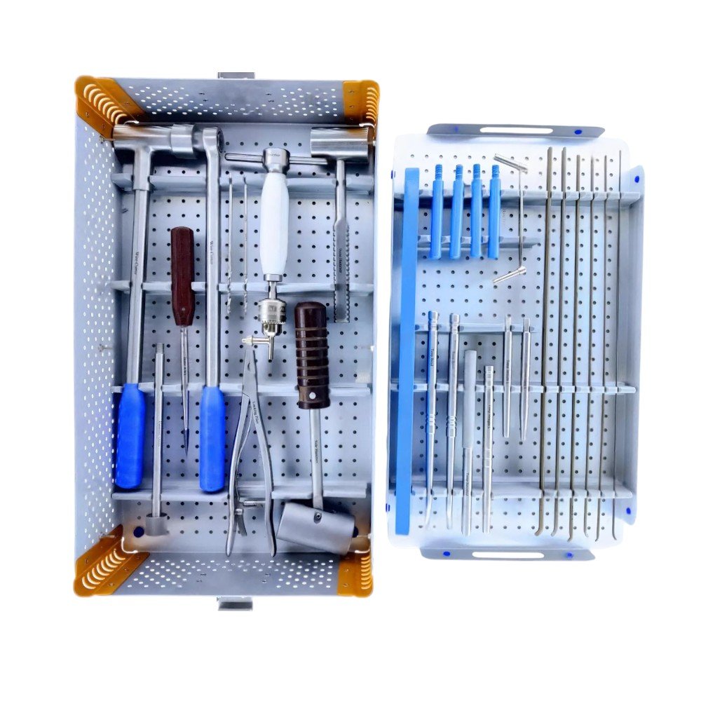 Includes locking plates, screws, and surgical tools for full procedure readiness.