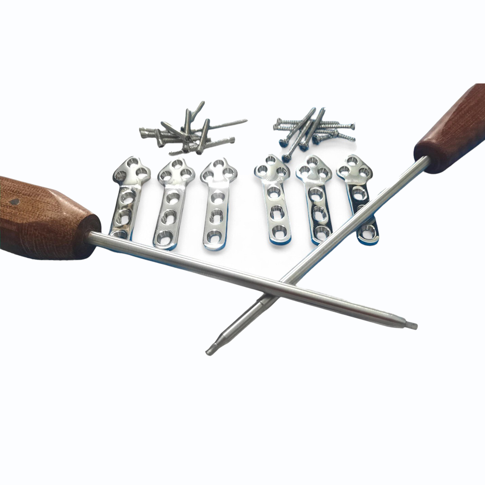 The Veterinary 2.7 mm TPLO Plates (46 mm) Left & Right with Screws – 44 pcs, SS 316L is engineered for veterinary tibial plateau leveling osteotomy procedures in small-breed animals. Constructed from SS 316L, these plates provide excellent strength and corrosion resistance required for postoperative weight-bearing. With left and right variants, the plates deliver precise anatomical conformity for improved surgical precision. At 46 mm in length, they are ideal for small canine tibias, ensuring secure fixation when paired with the included screws.