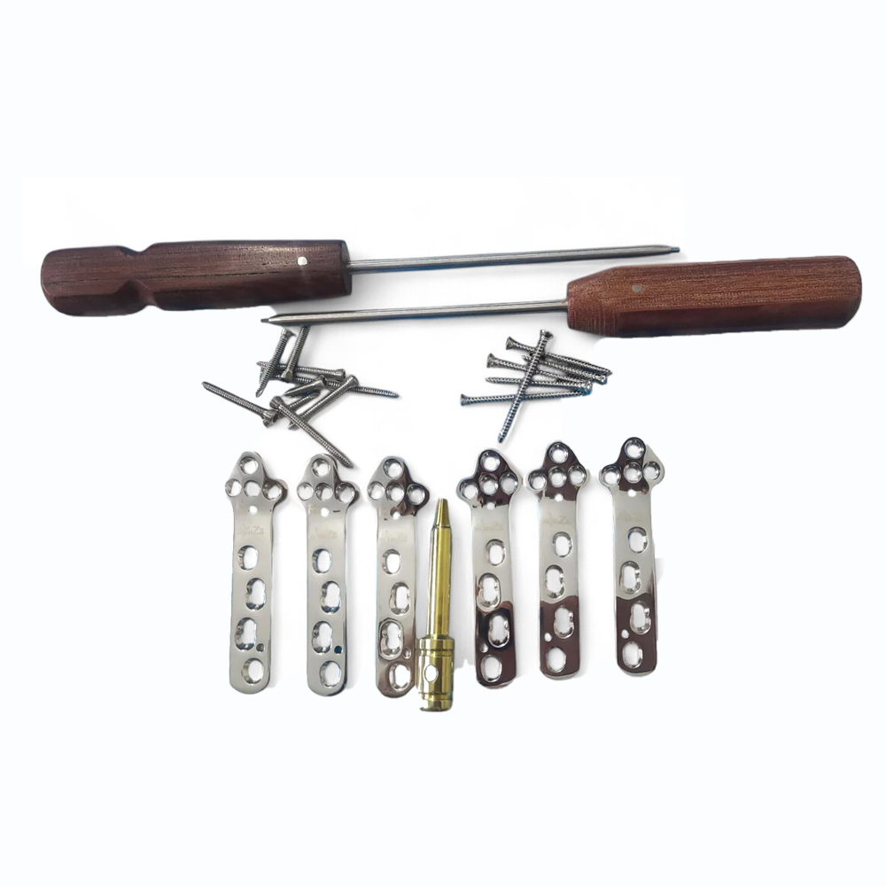 The Veterinary 3.5 mm TPLO Broad Plates (80 mm) Left & Right with Screws – 56 pcs, SS 316L is specifically engineered for veterinary tibial-plateau leveling osteotomy procedures. These plates are anatomically shaped for canine tibias and offer the mechanical robustness required for load-bearing stabilization following TPLO surgery. Manufactured from medical-grade SS 316L, the plates provide excellent strength, resistance to corrosion, and consistent performance under physiologic stress. The set includes both left and right plate variants along with matching screws, making it a complete kit for veterinary orthopedic centers.