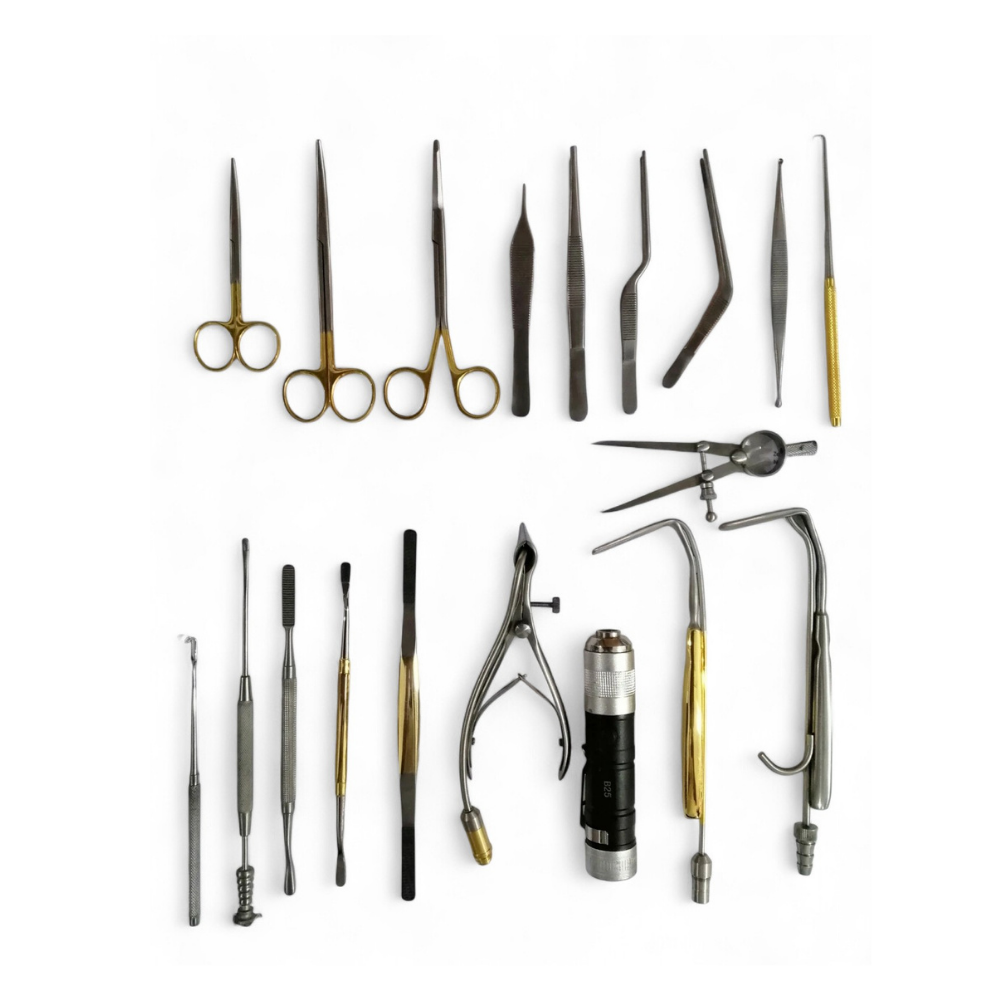 Includes elevators, scissors, forceps, scalpels, and retractors