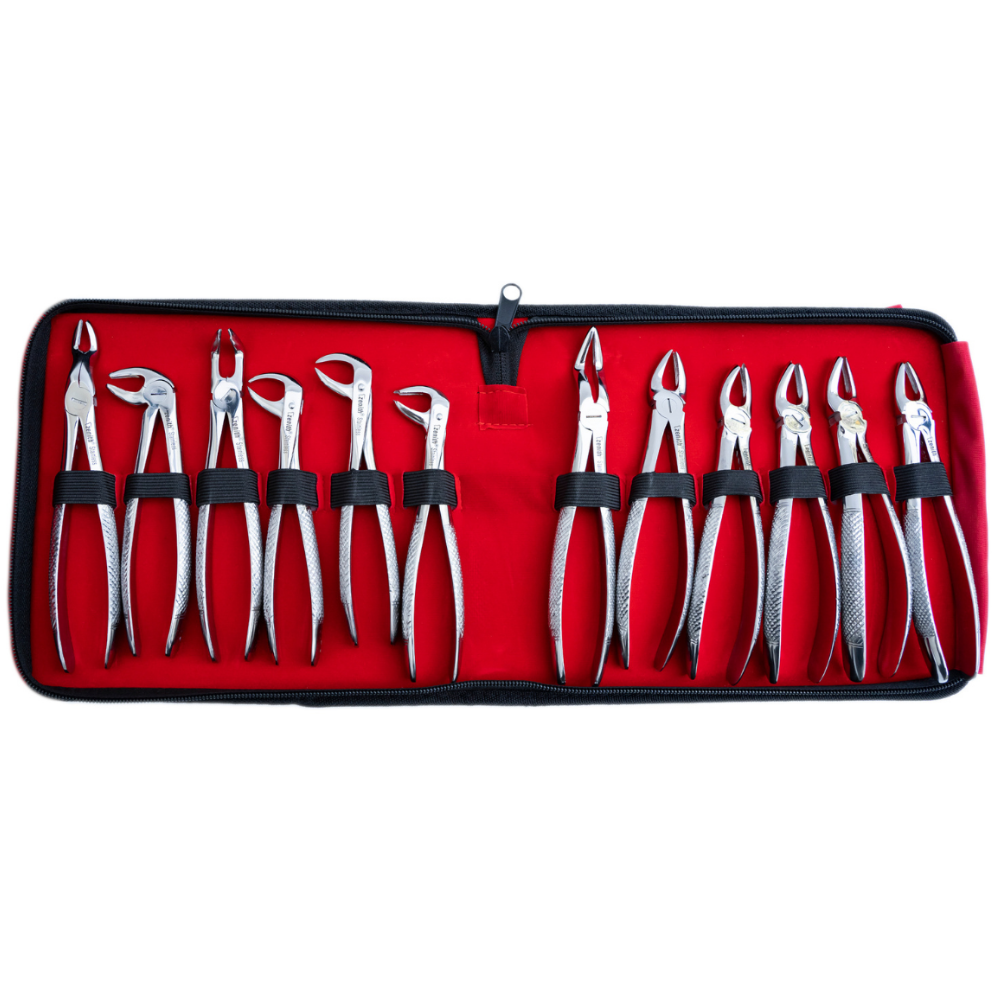 This 12-piece extraction kit provides a full range of forceps specially crafted for maxillary and mandibular teeth, roots, and surgical extractions. Each instrument features ergonomically designed handles that ensure a secure, non-slip grip while reducing hand fatigue during long procedures. The precision-engineered beaks conform closely to tooth anatomy, allowing controlled and safe extractions with minimal trauma to surrounding tissue.